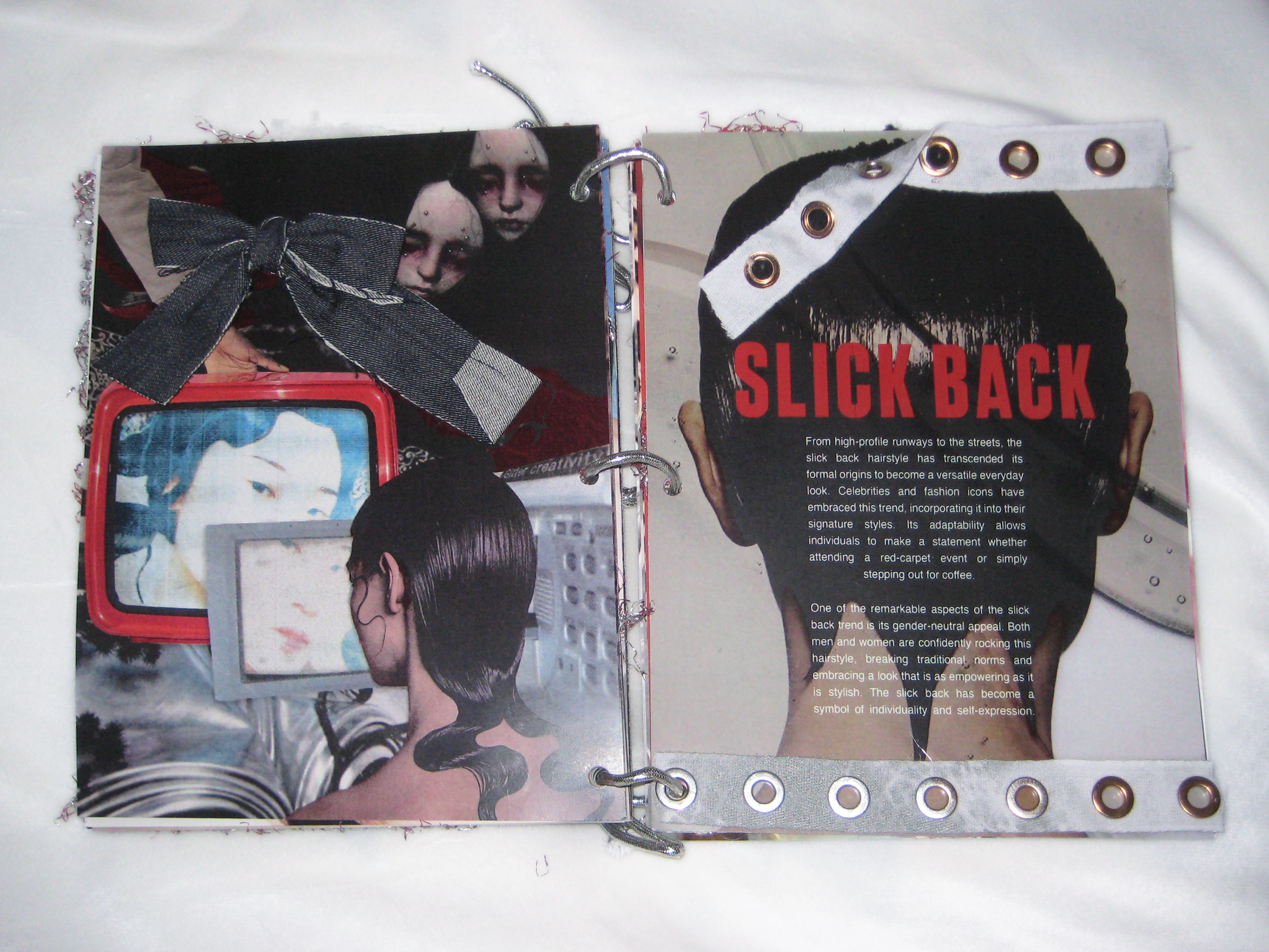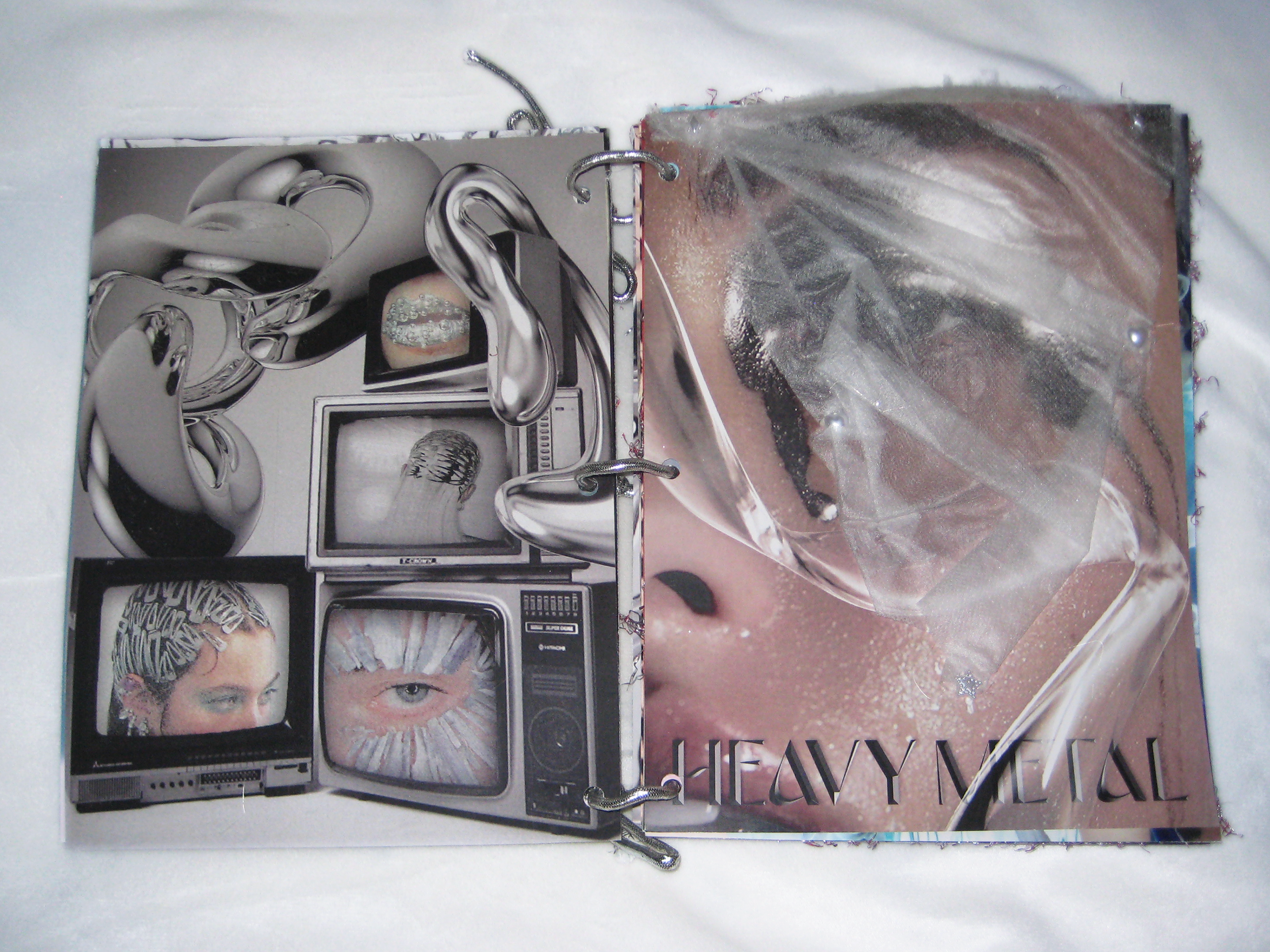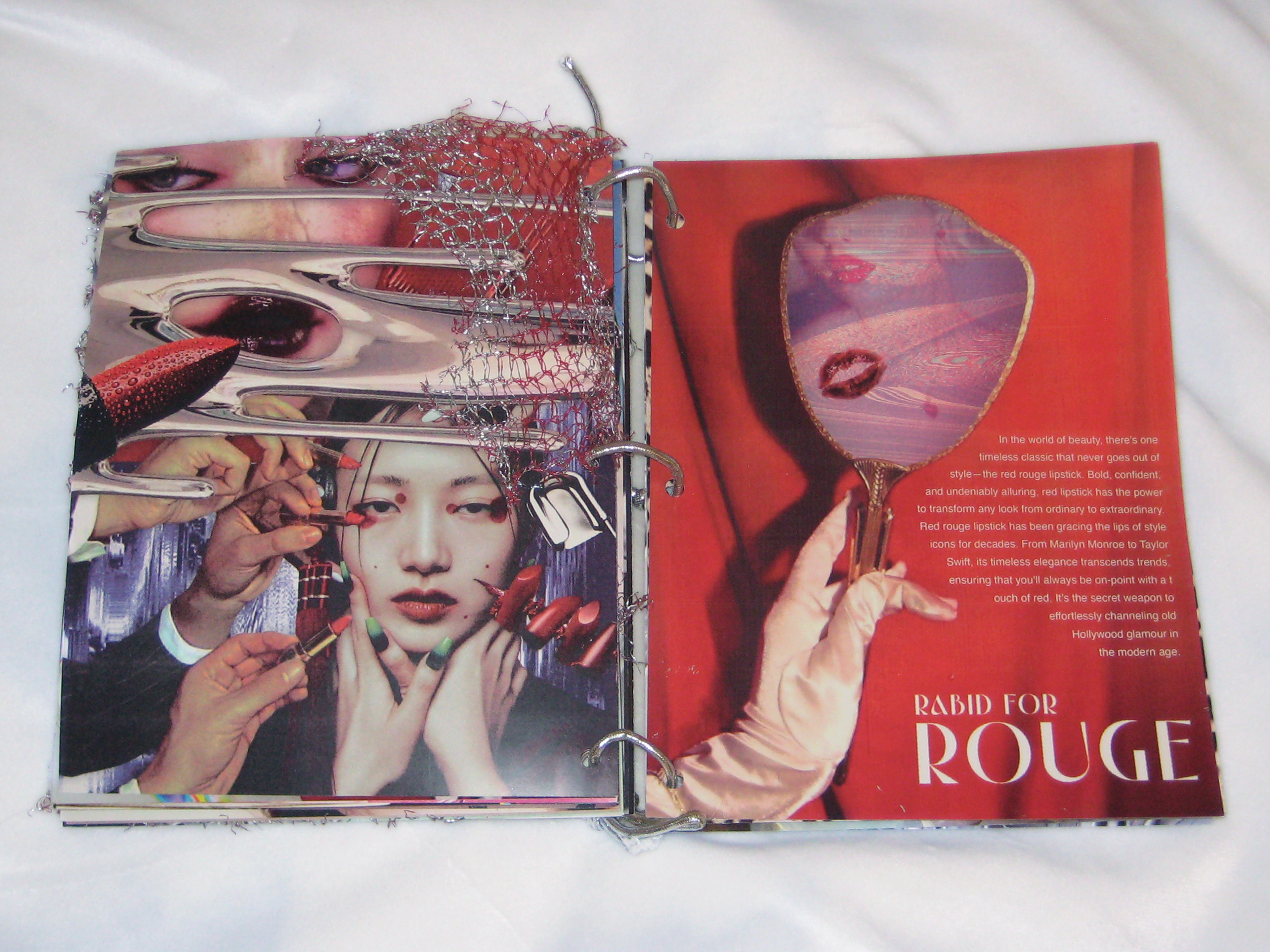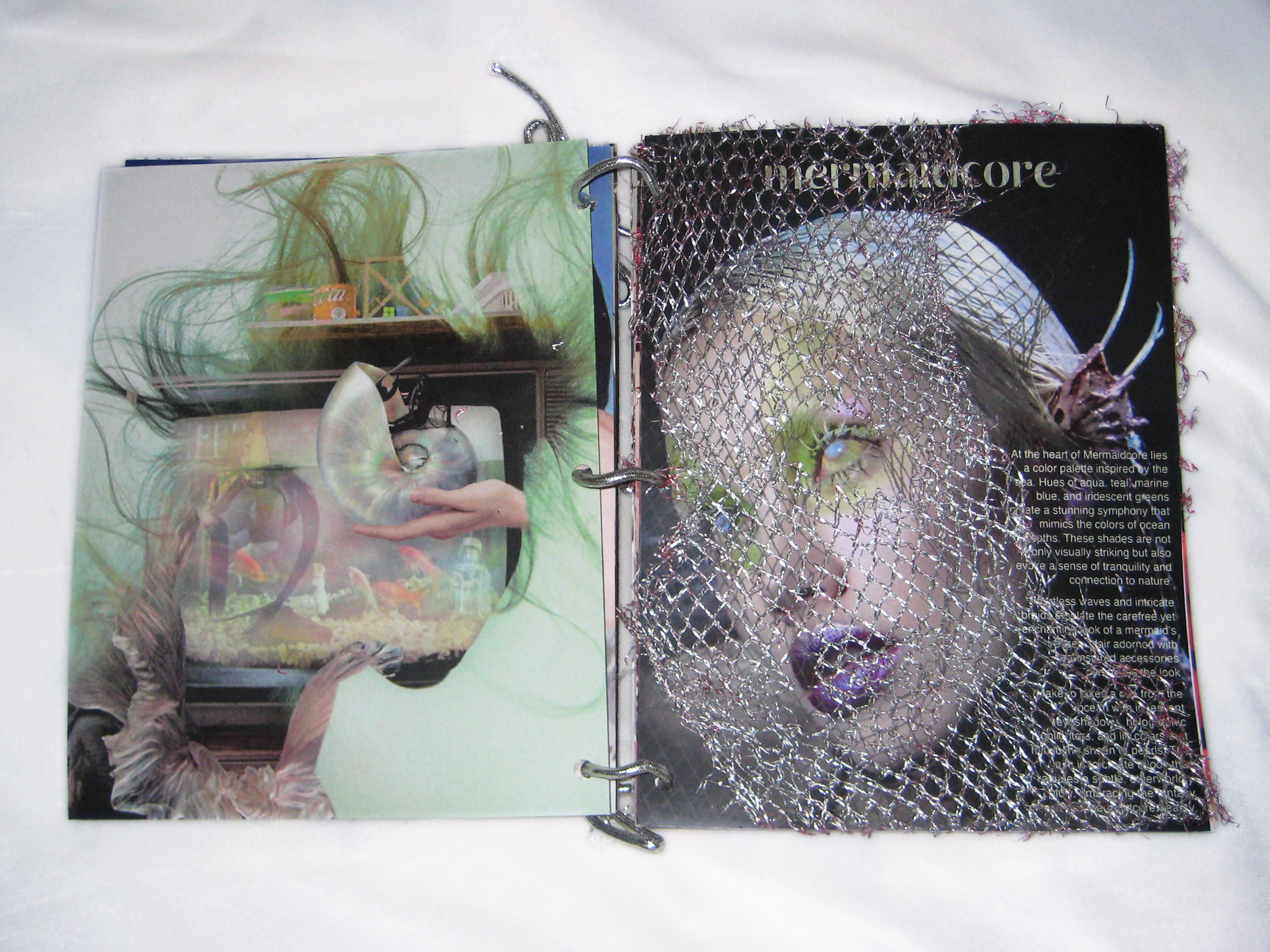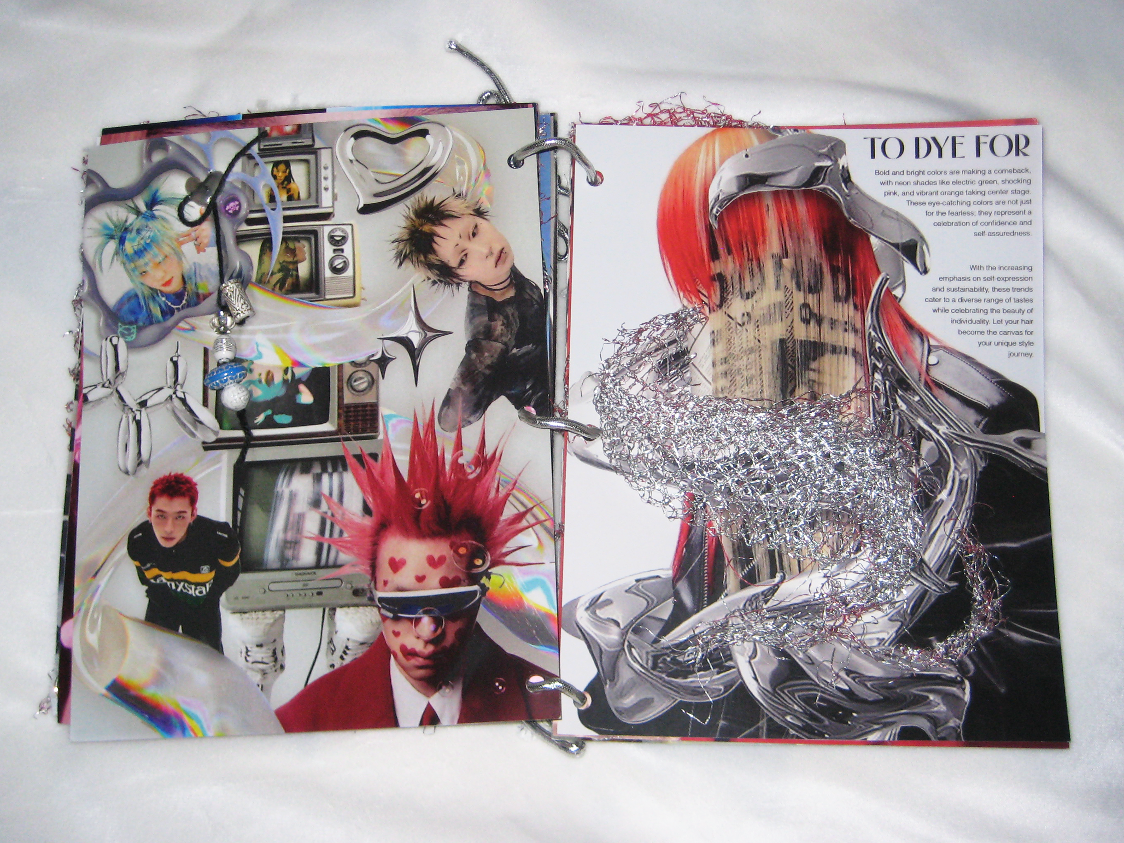 I created these spreads on the latest style trends for a cyber-retro themed lifestyle magazine. The pages are bound with silver chrome rope and feature physical attachments including netting, metalware, fabric, and beads.